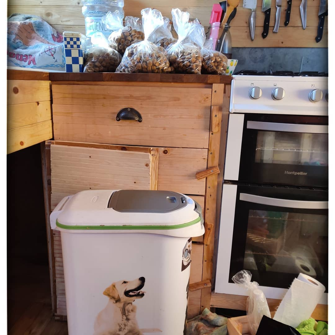 Diesel heater working woooo we can be warm without the need for hook up π spent the day fixing it and this evening sorting out the dog food. His container with all his kibble is kept in the cupboard under the sink. We take it out and fill bags with his daily allowance in them so we don't have to weigh it every day and wheel the big container out. Got me thinking. We buy 12kg bags at a time ….quite heavy big bags. Lucky we can buy his same food here. What do others who have dogs travelling around Europe do for dog food and storage ? πππππΎπΎπΎπΎπΎ