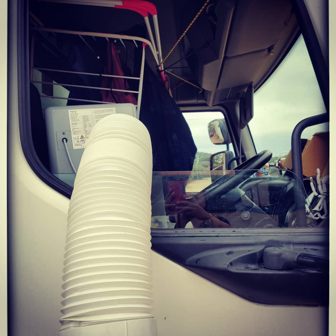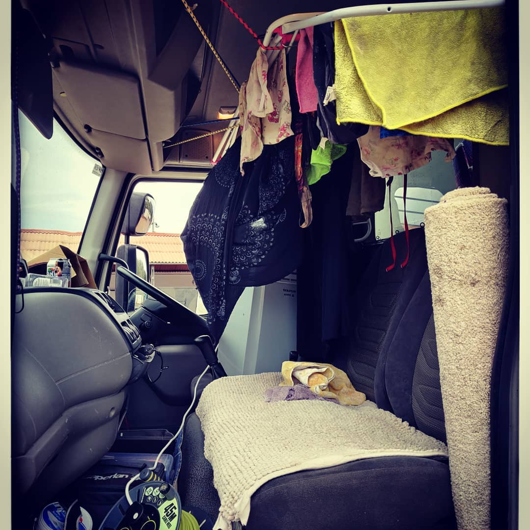 Parked up at the only Aire once more for its leccy All day washing and cleaning as the lorry has been so full of sand and it was everywhere. Weather has changed here so raining lots and grey yet still humid. Mr Florry came up with a great initiative to dry our washing. He used our heater and put it on in the cab so we didn't get too hot…. Worked a treat. Washing done and Florry thoroughly cleaned 🙂